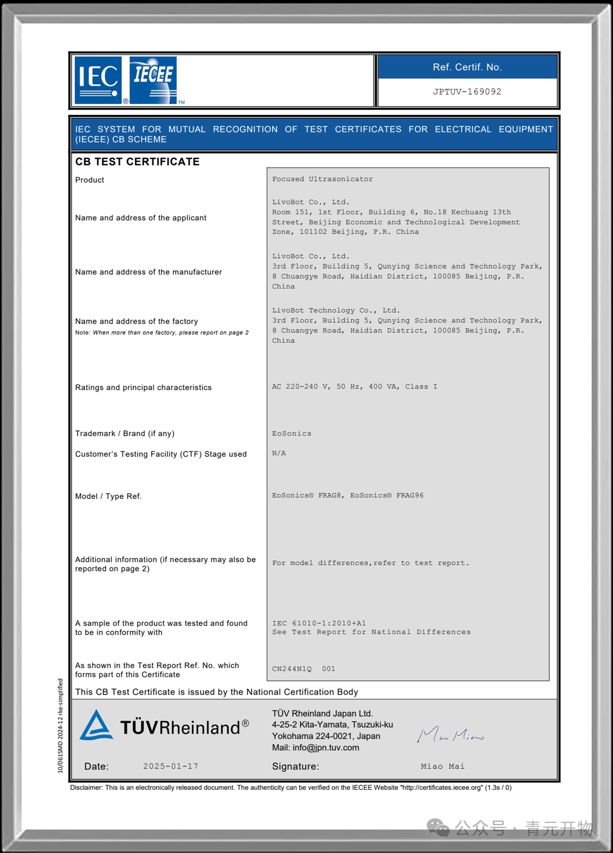 開年重磅 又添力“證”丨青元開物EoSonics? FRAG系列超聲聚焦打斷儀獲CB、CE雙重認證