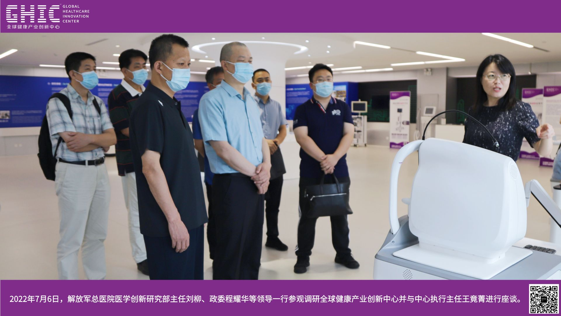2022年7月6日,解放軍總醫(yī)院醫(yī)學(xué)創(chuàng)新研究部主任劉柳、政委程耀華等領(lǐng)導(dǎo)一行參觀調(diào)研全球健康產(chǎn)業(yè)創(chuàng)新中心并與中心執(zhí)行主任王竟菁進行座談。