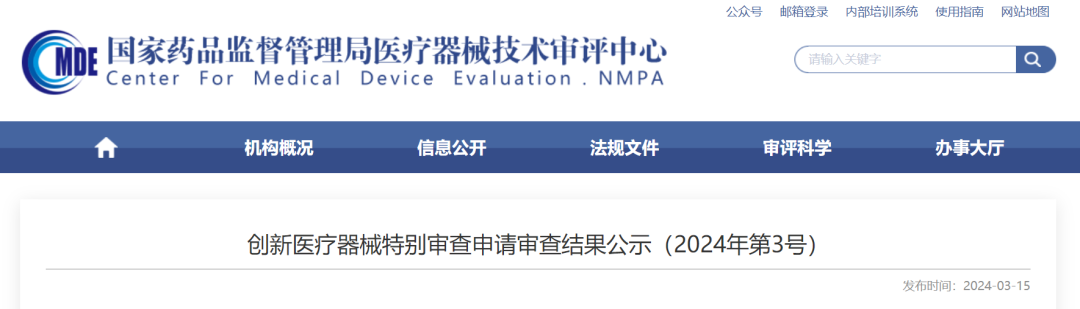 2024年3月15日,國家藥監(jiān)據(jù)醫(yī)療器械技術(shù)審評中心發(fā)布《創(chuàng)新醫(yī)療器械特別審查申請審查結(jié)果公示(2024年第3號)》。
