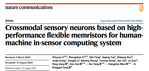 [8] Li, Z., Li, Z., Tang, W., Yao, J., Dou, Z., Gong, J., Li, Y., Zhang, B., Dong, Y., Xia, J., Sun, L., Jiang, P., Cao, X., Yang, R., Miao, X., & Yang, R. (2024). Crossmodal sensory neurons based on high-performance flexible memristors for human-machine in-sensor computing system. Nature Communications, 15, 7275. https://doi.org/10.1038/s41467-024-51609-x