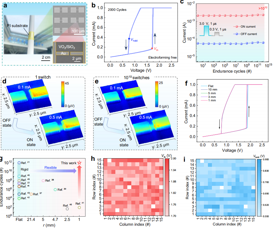 Fig. 2 | Structure and electrical characterization of the flexible VO2 memristor.