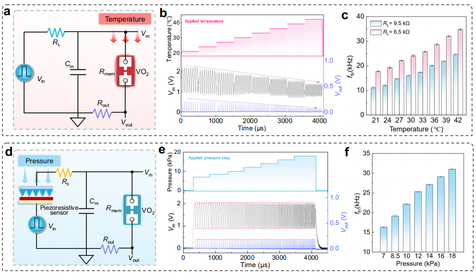 Fig. 3 | Temperature and pressure sensing and encoding characteristics of the artificial spiking sensory neuron.