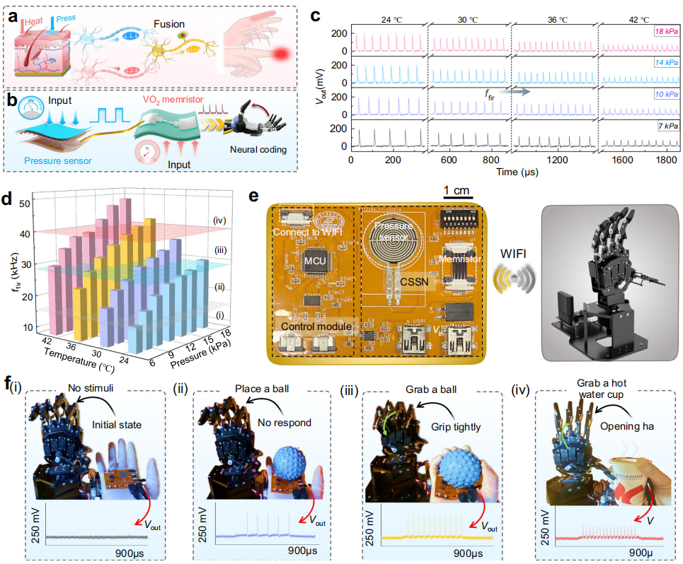 這種CSSN的設(shè)計(jì)靈感來(lái)源于人類的感覺(jué)神經(jīng)系統(tǒng),它通過(guò)高度集成的電路模擬了人類神經(jīng)元的尖峰編碼機(jī)制。圖1所示,CSSN由柔性VO2憶阻器和壓阻傳感器組成,能夠?qū)崟r(shí)響應(yīng)外部刺激,產(chǎn)生類似于生物神經(jīng)元的尖峰信號(hào)。這種信號(hào)的頻率和幅度隨著刺激的強(qiáng)度而變化,從而實(shí)現(xiàn)了對(duì)多模態(tài)信號(hào)的編碼。