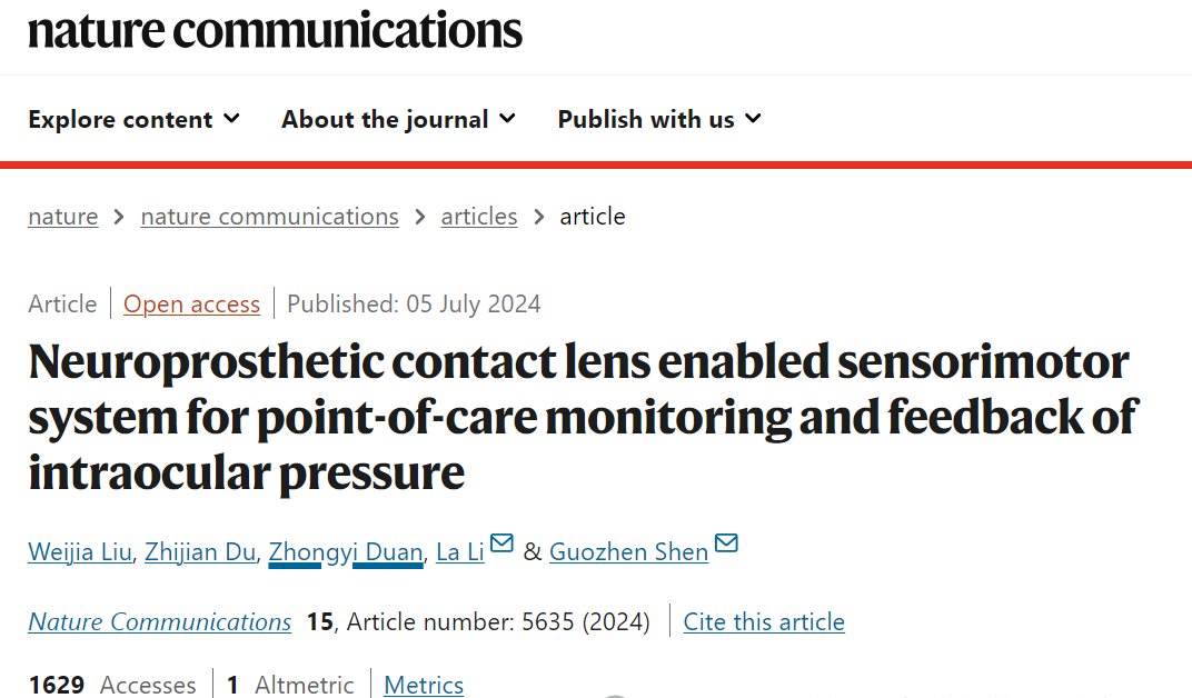 [1] Liu, W., Du, Z., Duan, Z. et al. Neuroprosthetic contact lens enabled sensorimotor system for point-of-care monitoring and feedback of intraocular pressure. Nat Commun 15, 5635 (2024). https://doi.org/10.1038/s41467-024-49907-5