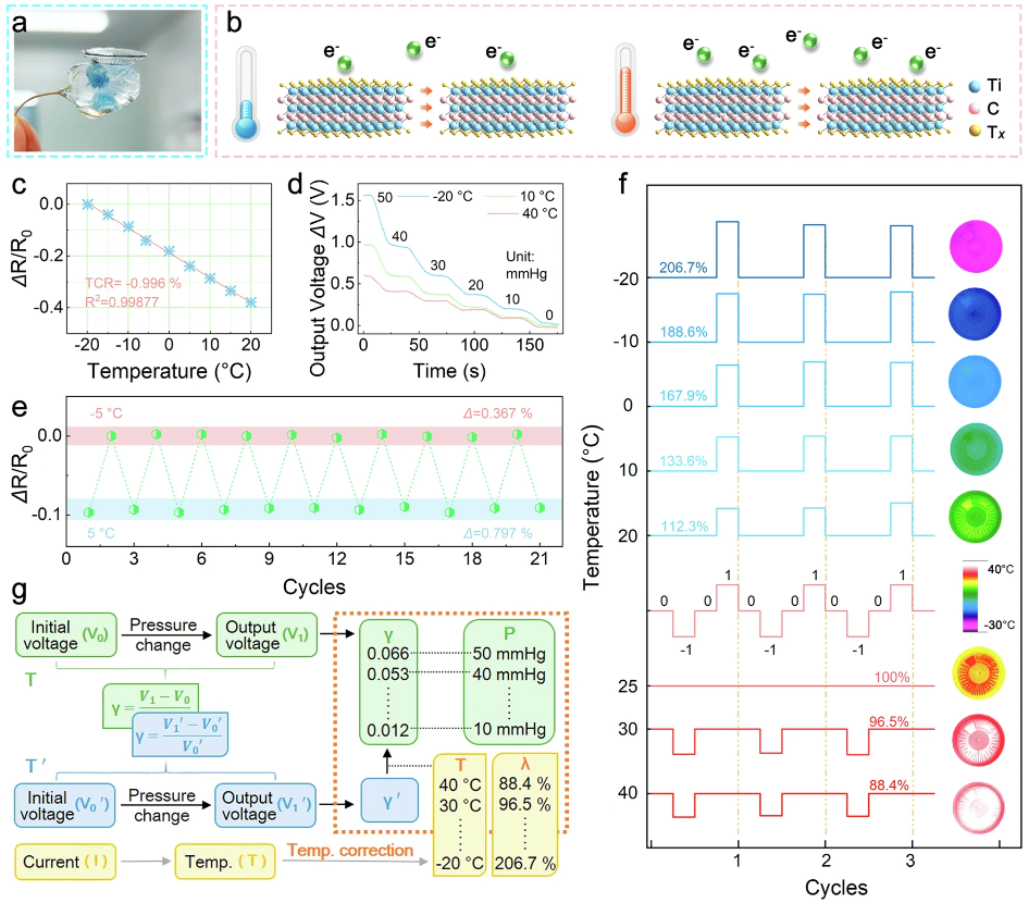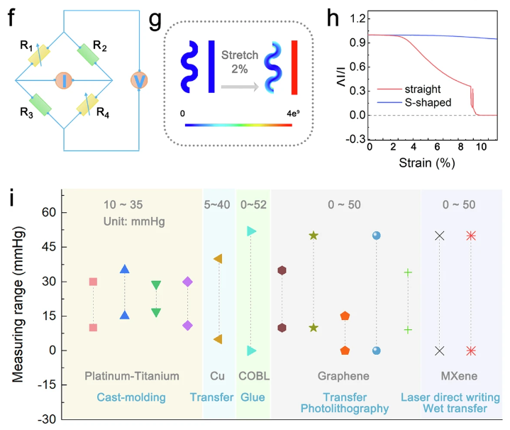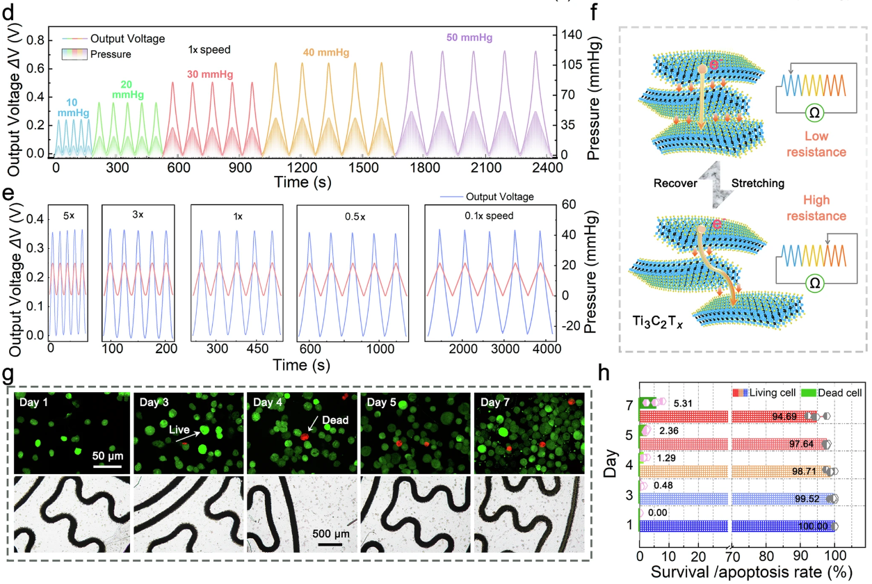 由于引入了蛇形電極設(shè)計(jì),Ti3C2T_x_ MXene基應(yīng)變傳感器實(shí)現(xiàn)了12.52 mV/mmHg的高靈敏度和優(yōu)越的穩(wěn)定性(在1小時(shí)后沒有顯著的性能下降),這使得溫度校正的電信號(hào)傳輸?shù)缴窠?jīng)中心,并調(diào)節(jié)相應(yīng)的運(yùn)動(dòng)活動(dòng)以警告眼壓的增加或減少。