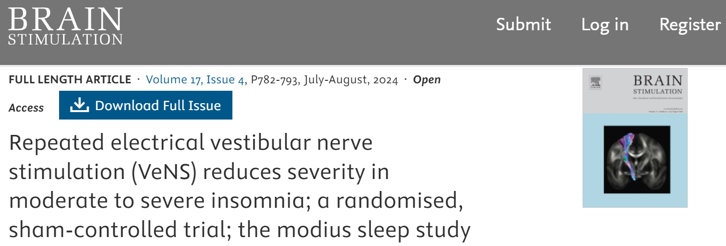 2024年7月,《Brain Stimulation》刊登了一項(xiàng)關(guān)于Modius Sleep的研究報(bào)告。這是一個隨機(jī)、雙盲的對照試驗(yàn),研究 Modius Sleep 重復(fù)前庭神經(jīng)電刺激 (VeNS) 減輕中度至重度失眠的表現(xiàn)。