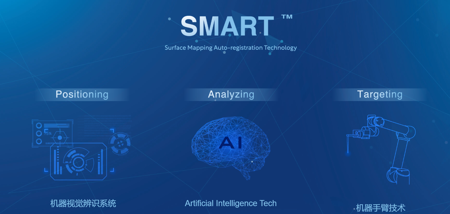 核心技術(shù)支持是 SMART(Surface Mapping Auto-registration Technology)平臺(tái),它通過(guò)結(jié)合機(jī)器視覺(jué)、機(jī)器人技術(shù)和AI技術(shù),實(shí)現(xiàn)手術(shù)中的“實(shí)時(shí)成像”、提高精確度,并讓手術(shù)更加微創(chuàng)。