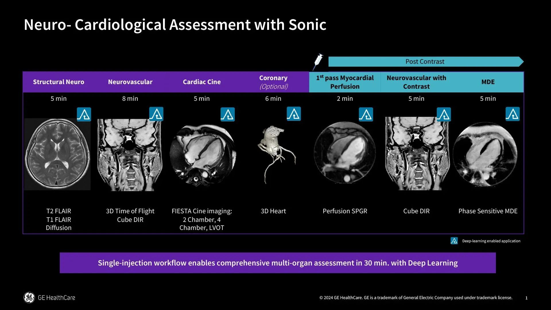 本次RSNA會(huì)議上展出的腦心同掃磁共振解決方案,通過(guò)最新Sonic深度學(xué)習(xí)平臺(tái)實(shí)現(xiàn)了全序列深度學(xué)習(xí)支持,將檢查時(shí)間縮短到半個(gè)小時(shí),同時(shí)大幅提升了一站式檢查的成功率,僅需一次打藥就能為腦心同治提供最全面的診斷信息。