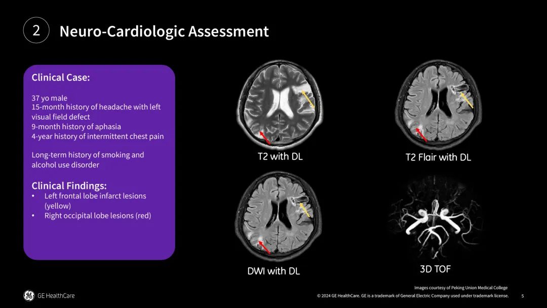 診斷挑戰(zhàn):37歲男性患者,病史復(fù)雜,15個(gè)月前開(kāi)始出現(xiàn)頭痛并伴隨著雙眼左側(cè)視野的缺失(偏盲)。9個(gè)月前出現(xiàn)說(shuō)話困難癥狀。曾經(jīng)接受過(guò)心臟房間隔缺損封堵手術(shù)。且該患者有長(zhǎng)期吸煙和酗酒的習(xí)慣,在過(guò)去四年里存在間歇性胸痛癥狀?;颊叩陌Y狀累及多個(gè)系統(tǒng),需要綜合評(píng)估和治療。