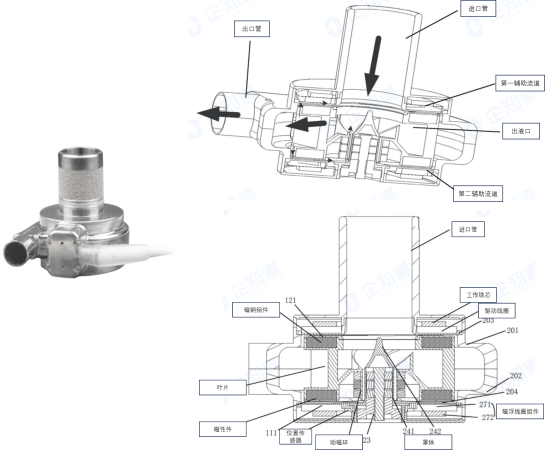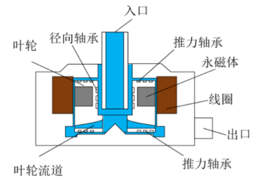 離心式磁懸浮血泵主要由磁懸浮軸承、葉輪轉子、流道、外殼部件以及驅動電機等組成,示意圖如下圖所示,離心式磁懸浮血泵的工作原理是:電機產生磁場驅動葉輪旋轉,葉輪旋轉后,血液從泵體的軸向流入,通過流道入口進入泵體后,經過葉輪并在葉輪旋轉力的帶動下,發(fā)生離心旋轉運動,從血泵徑向外沿將血液甩出流道出口,從而將血液泵出。