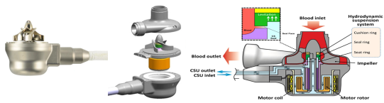 血液通過該裝置血泵的入口管從左心室流入血泵,磁懸浮葉輪將血液加壓從出口管泵入主動脈,從而完成血液灌注。CH-VAD 也采用優(yōu)化的大間隙磁懸浮設計,其體積較 EVAHEART Ⅰ更小,經皮電纜直徑更小,內置電線更少,大大降低了感染風險,且其制造成本較同類產品相對較低。直徑47mm,厚度25mm,重量為186g,泵血流量2-10L/min,轉速1000-4200r/min。