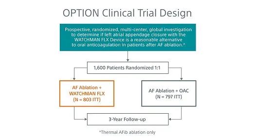 Watchman此次適應癥擴展主要基于OPTION臨床試驗——這是一項多中心、前瞻性、隨機對照試驗,在全球114家機構中納入了1600名消融術后NVAF患者,直接對比Watchman FLX與OAC(主要為直接口服抗凝藥DOAC)在中風預防與出血控制方面的表現。