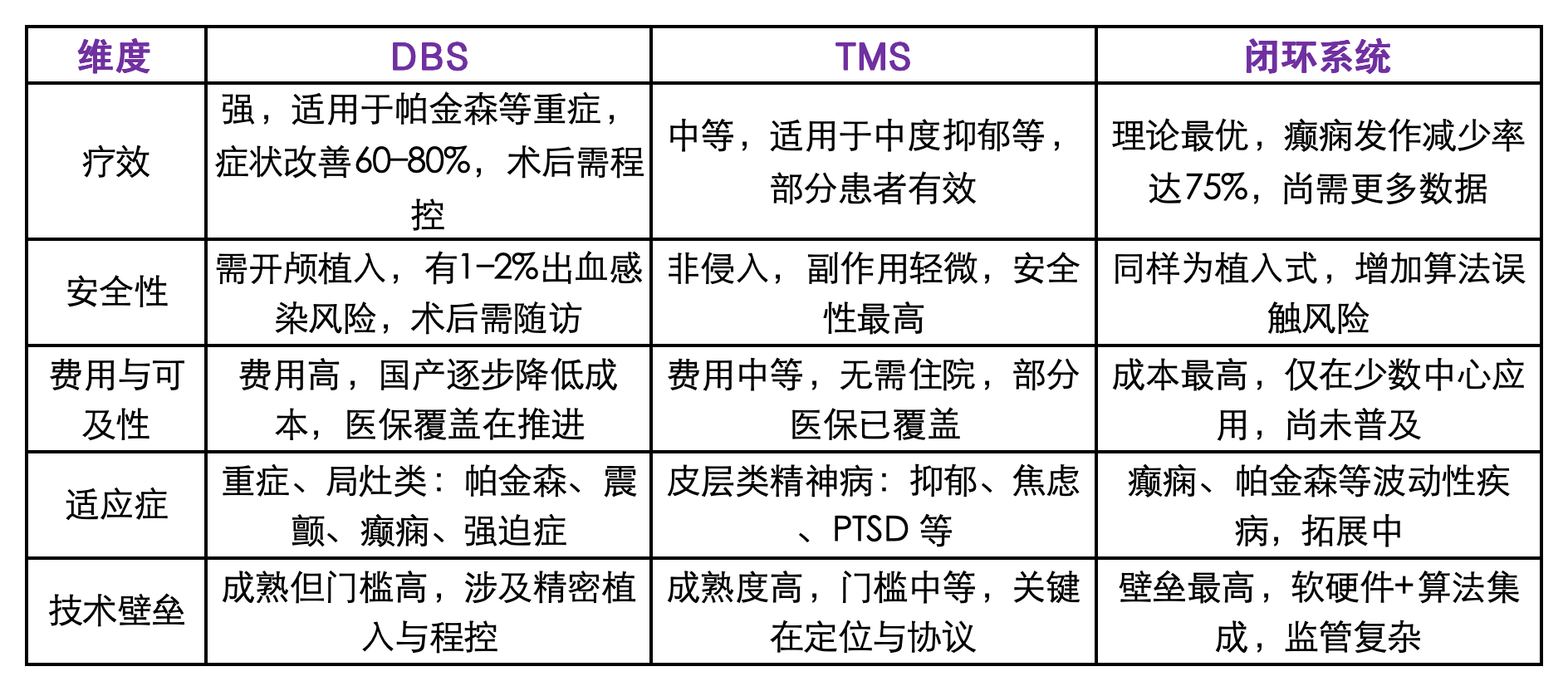 神經(jīng)調(diào)控領(lǐng)域的DBS、TMS與閉環(huán)系統(tǒng)三大技術(shù)路徑各有優(yōu)劣,其在療效、安全性、成本、適應(yīng)癥和技術(shù)壁壘等方面存在明顯差異。